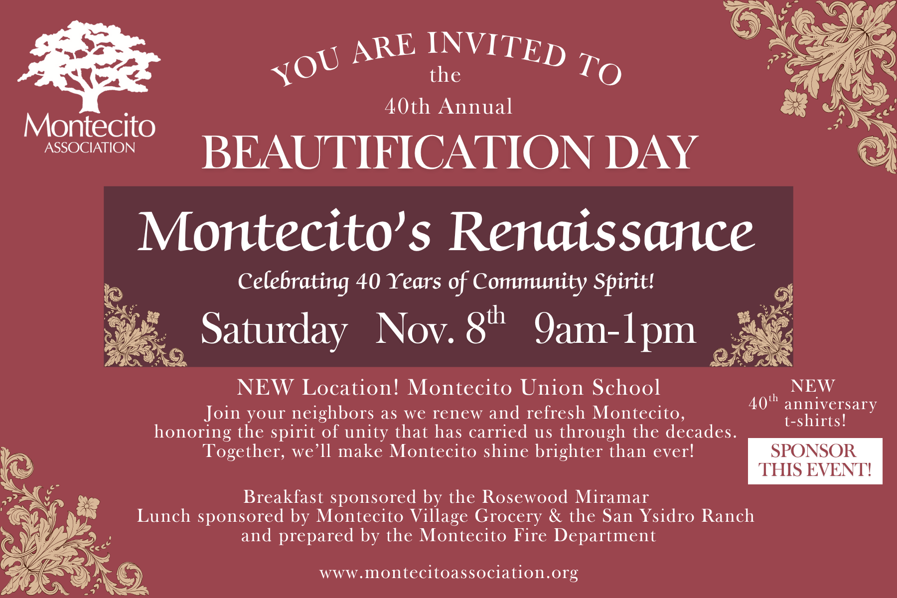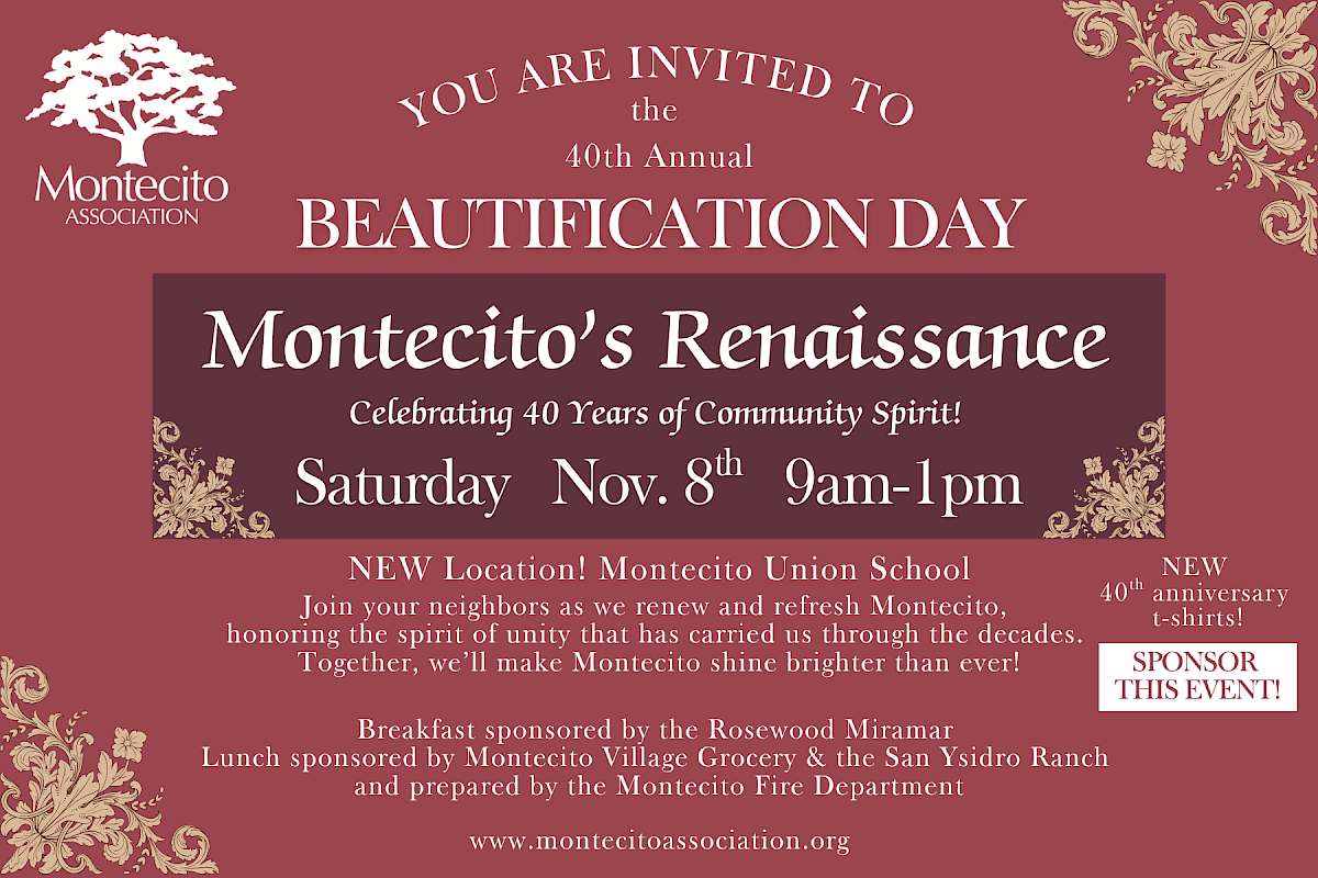 This year, the Montecito Association proudly celebrates the 40th anniversary of Beautification Day with the theme “Montecito’s Renaissance.” Just as the Renaissance was an era of renewal and creativity, this day reflects the spirit of our community coming together to restore, refresh, and reimagine Montecito’s natural beauty. Neighbors, families, schools, and local organizations will join hands to clean, plant, and uplift our shared spaces—honoring our legacy while embracing a new chapter of unity and spirit. After four decades, Beautification Day continues to embody the best of Montecito: resilience, togetherness, and a collective commitment to keeping our community shining bright.