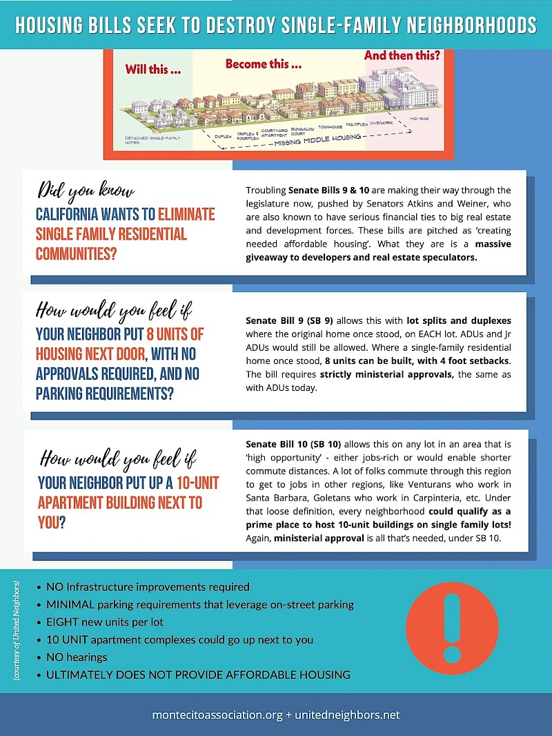 California Senate Leadership passed several bills, some of which could help the Montecito community, and some of which can harm it greatly. We have hired our former State Senator Hannah-Beth Jackson to navigate us through this process and to the extent we can, get amendments that can protect Montecito. We participated in Senate and Assembly committee hearings to testify, submitted position letters, and joined with other communities as part of United Neighbors, CALE, and CATALYST.